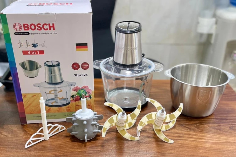 خردکن بوش 4+4 لیتری دو کاسه تیغه 6+6 تیتانیوم طلایی سیر پوست کن و همزن موتور حک شده 3000 وات مدل 2024